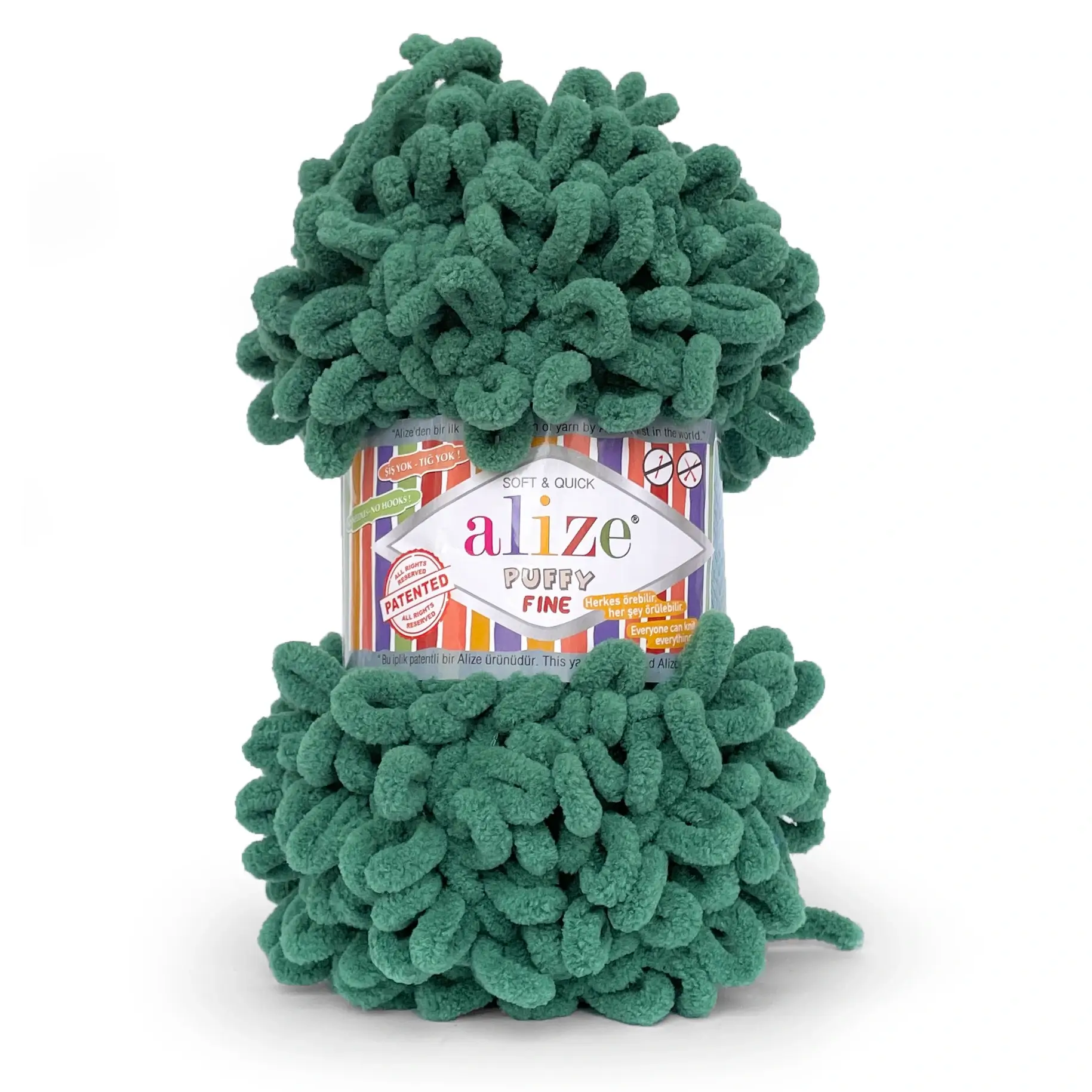Alize Puffy Fine 532 — це ніжна та бархатиста пряжа для в’язання без спиць і гачка в зеленому кольорі. Завдяки унікальній структурі з маленькими петельками вона підходить для створення пледів, светрів, дитячих речей і декору навіть для початківців.